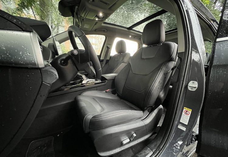 Las sillas delanteras cuentan con ajuste eléctrico, sin acomodación lumbar, terminadas en cuero sintetico de buena sujeción. El volante tiene nivelación manual en altura y profundidad, con un diseño achatado abajo y terminado en cuero, se le suman mandos para multimedia y asistencias en la conducción.